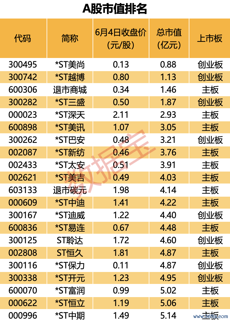6月4日晚,*ST深天发布公告称,公司股票6月4日收盘市值低于3亿元,根据交易所相关规定,公司首次出现该情形的,应当在次一交易日开市前披露公司股票可能被终止上市的风险提示公告。若公司股票收盘总市值连续二十个交易日低于3亿元,公司股票将存在被终止上市的风险。这意味着,*ST深天将有可能成为史上第一只因为市值不达标,触及交易类退市指标的公司。