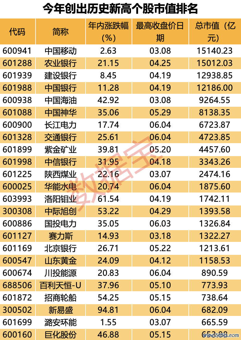 从市值角度来看正规期货配资公司,中国移动、农业银行、建设银行、中国银行4只万亿市值股票今年股价创出历史新高;此外还有中国海油、中国神华、长江电力等14只千亿市值股票也创出新高。