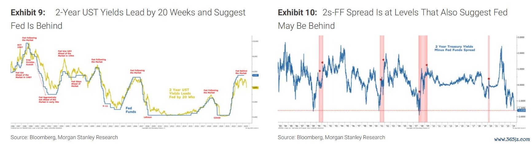 摩根士丹利美股团队近期也提及,由短端收益率下行引领的重新陡峭化正在发生。从技术上讲,2年期和10年期国债收益率差正在接近零,但更重要的是,它似乎已经突破了近期的阻力位,这表明曲线在短期内可能会进一步陡峭化。观察2年期国债收益率与联邦基金利率的关系,可以看出债市认为美联储已落后于形势——目前2年期国债与联邦基金利率的差距为-160个基点,这个水平在过去40年中只有3次达到过(分别是在2007年12月、2001年1月和1989年6月)。