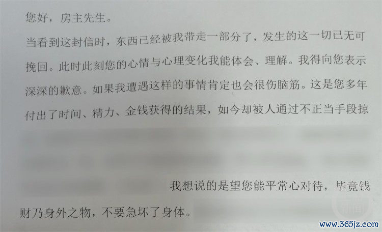 “您好,房主先生。当看到这封信时,东西已经被我带走一部分了,发生的这一切已无可挽回。”在写给失主的信中,嫌疑人“安慰”道,“望您能平常心对待,毕竟钱财乃身外之物,不要急坏了身体。”